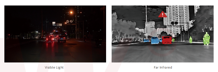 MHNV has different type thermal car camera, different resolution such as 640*512px, 384*288px,256*192px, higher resolution clearer image effect, you also can match AI control box for identify the pedestrian and animals.